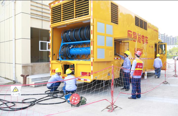 6月21日,yl23411永利集团股份公司电力事业部运检中心工作人员正在广安市体育馆模拟演练用应急发电车发电,保障市区重要会议供电。